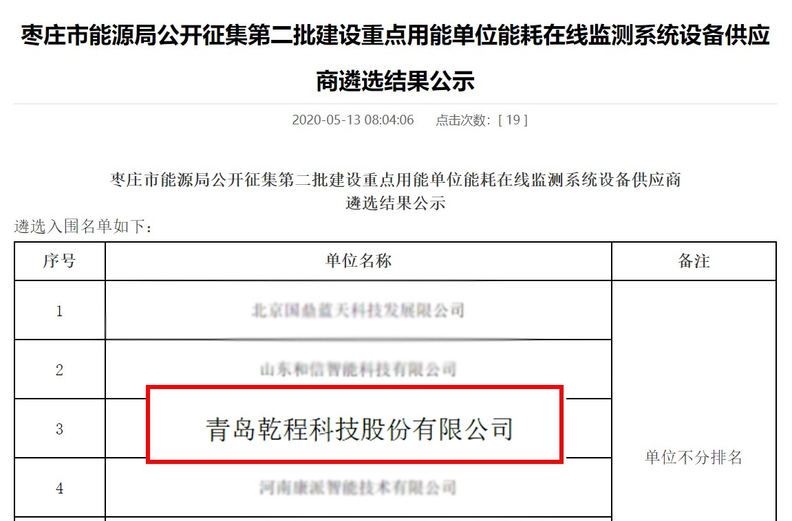 2020年4月15日,枣庄市能源局发布了《关于征集第二批建设重点用能单位能耗在线监测系统(企业能源管理中心)设备供应商的函》,接到通知后,公司时间组织“乾程科技百千万在线监测项目组”认真研读标书和招标要求,多部门联合,前往枣庄实地调研;经过多次线上、线下会议讨论,加班加点赶制投标材料,终以优异的资质成功入围。